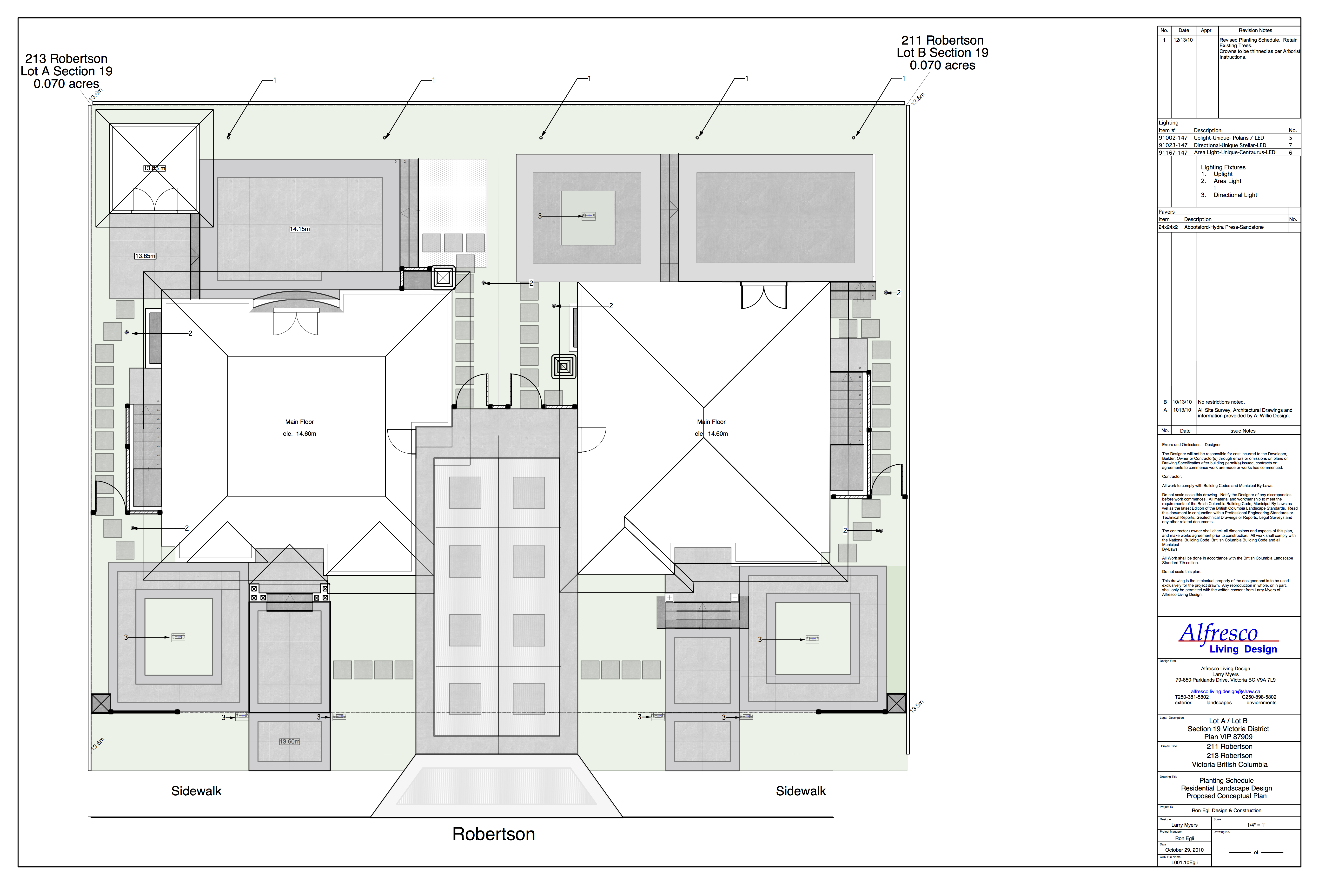 The two homes have a basement, main floor and upper floor, each with a foot print of approximately 750 square feet, and have a minimal set back. The residences are situated on respective properties of approximately 3000 square feet. The residences have an adjoining driveway and are situated parallel to one another on the properties. A conventional landscape would have appeared under scaled in comparison to the two structure. I felt it was necessary to have the landscape appear in context and of a scale with significant weight relative to the residences. In order to achieve this I increased the scale of the hardscaping element. The patios, walkways, and transitional hardscaping fits the scale of the residences even though there were significant spatial constraints.